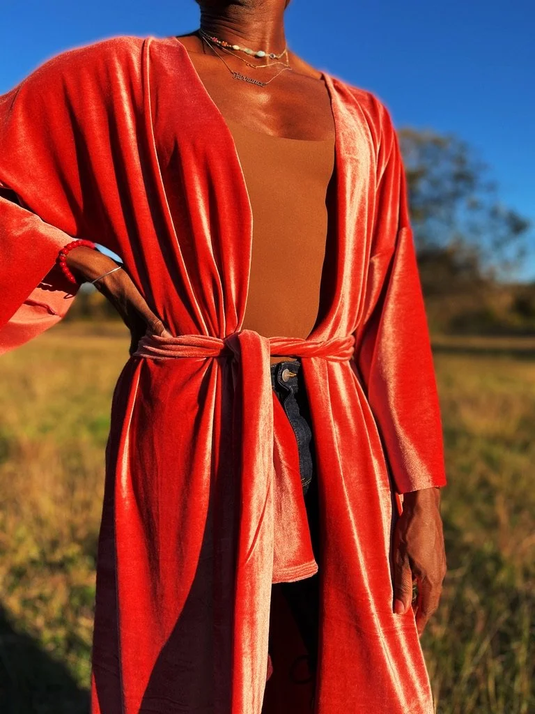 This duster was such a fun project for me. I finally find myself with time on my hands and the freedom to create things for myself instead of just for my business. I’ve been wanting to create this velvet duster for a while now. I of course got the fabric from Joann Fabrics and Crafts and picked up a few more colors also (red, gold and green). I knew I wanted it to be longer sleeved and I knew I wanted to be able to belt it with matching material. The amazing thing about the duster pattern is the versatility it brings when wearing it. You can wear any of the dusters open, belted and closed, belted and opened and overlapped for a wrap dress look and feel. I knew that’s what I wanted with this duster. I wanted to be able to wear it casually or be able to wrap it into a dress and I’m very happy with the end results! I took these shots in the field by the house, my favorite place to shoot during golden hour and I had to take product shots of the new purses so decided to combine the photo shoots into one! I’ve added 3 new purses to the site; starry night, stained glass and Fos Strength. Each one really goes well with the velvet duster! I just paired the duster with my favorite Nubian Skin body suit and jeans and boots! A simple yet elevated look. Shop the bag collection here!